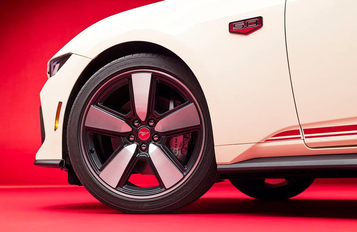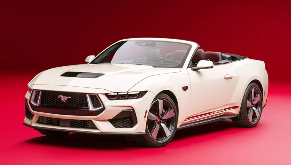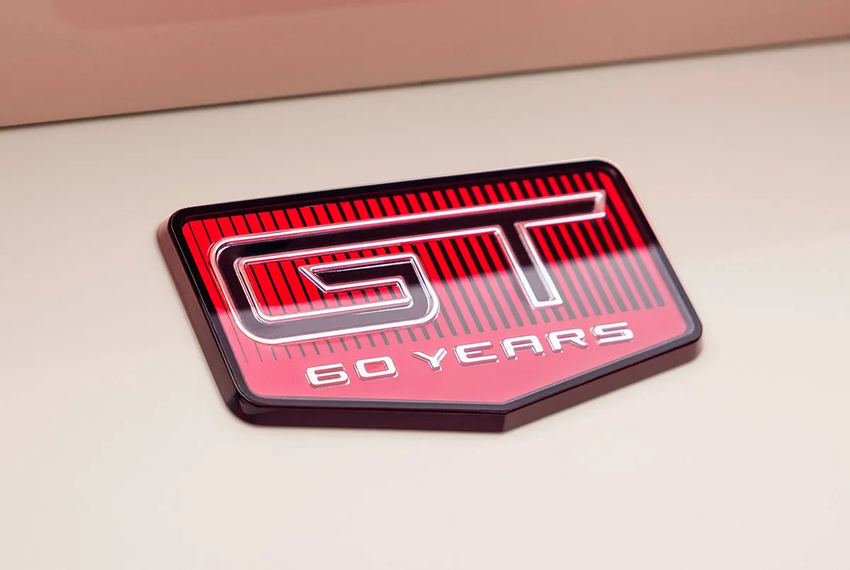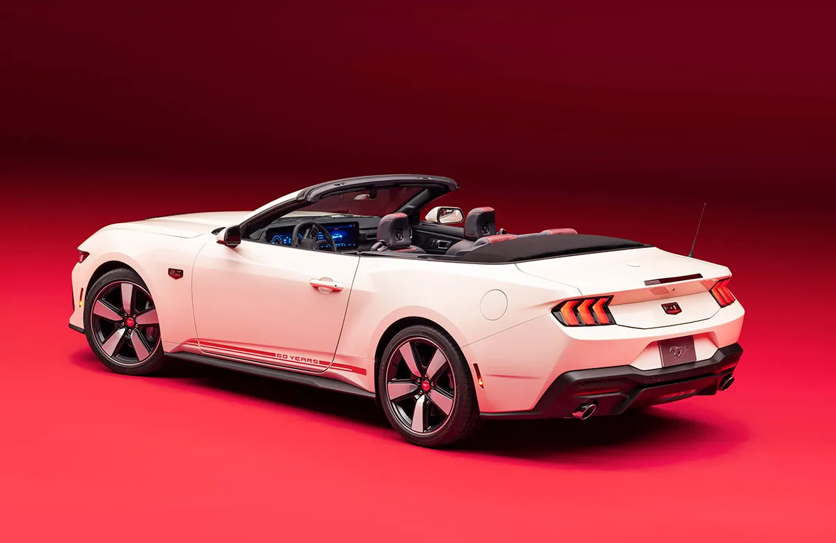 A edição limitada de 60º aniversário do Mustang tem como base o modelo GT Premium 2025, com motor V8 5.0. Ela estará disponível nas versões cupê e conversível, com transmissão manual ou automática, a partir do segundo semestre nos Estados Unidos, quando também será anunciado o seu preço. O esportivo traz emblemas exclusivos de 60º aniversário nos para-lamas e na tampa do porta-malas. As rodas de 20 polegadas também são exclusivas, com acabamento em cinza escuro, detalhes usinados brilhantes e uma tampa central vermelha de alumínio de estilo retrô.