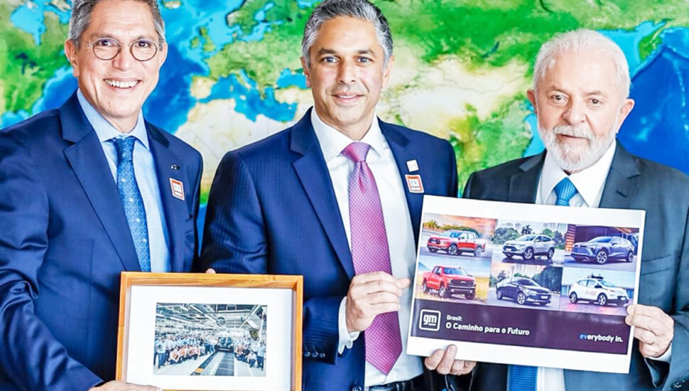 Santiago Chamorro, presidente GM América do Sul; Shilpan Amin, presidente da GM Internacional e Luiz Inácio Lula da Silva, Presidente da República. Credit: Presidência da República