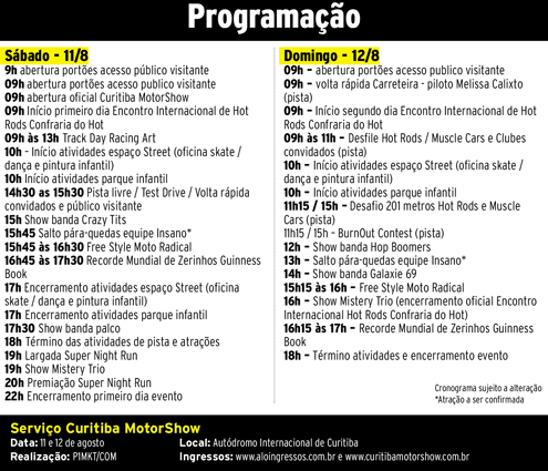 Haverá o Espaço Die Cast, com encontro de miniaturas e colecionadores; exposições de clubes e carros personalizados; volta rápida em carro com Mauricio das Neves (um dos maiore,s pilotos do rally cross country do Brasil); a presença de um dinamômetro da Prado Power Chips, para quem quiser conhecer a potência e os limites do seu carro de forma técnica; o Freestyle Moto Radical, com pilotos sobre duas rodas literalmente voando na pista do autódromo; e o destaque para a volta de abertura da pista executada pela empresária Melissa Calixto, proprietária de uma das únicas carreteiras do Paraná, um raro exemplar Ford 1946 que pertenceu ao piloto Agostinho Tozo.