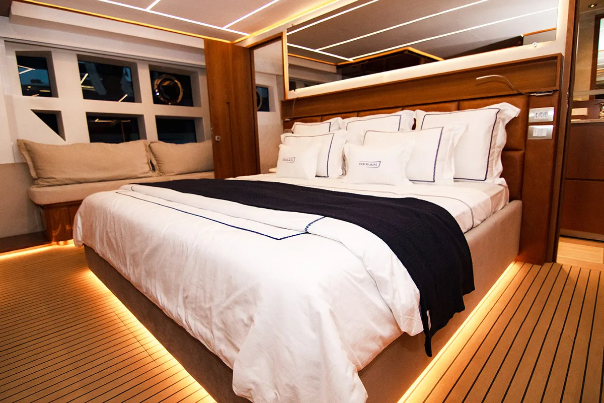 O Atelier Carine Sartore, especializado na criação e produção de enxovais exclusivos para iates, com um portfólio de produtos que contempla desde a rouparia de cama e banho das cabines até as áreas de convivência, cuidou de todo o enxoval e almofadas das embarcações. As embarcações também foram decoradas com peças da marca Atelieria, conhecida pelas criações marcadas pela autenticidade e romantismo, além da combinação de desenhos, cores, texturas, tecidos e bordados de alto padrão. Para a Okean 80, a marca desenvolveu uma linha exclusiva “Al Mare”, com kimonos, pijamas em seda pura, toalhas estampadas, mantas para as cabines e linha kids, com ursos, colchas, tênis e vestidos.