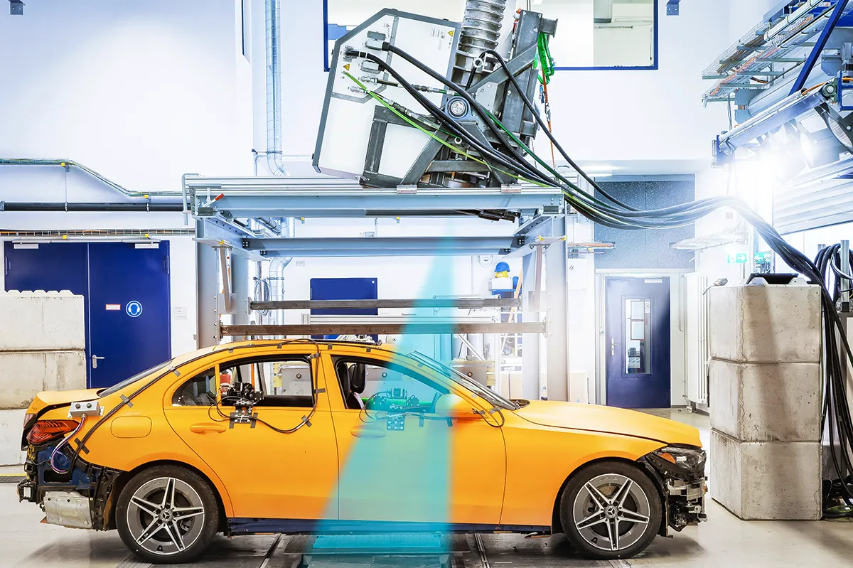 Por vários anos, a Mercedes-Benz vem pesquisando o uso da tecnologia de Raio-X em testes de colisão em conjunto com a EMI. O fator decisivo para o avanço foi o uso de um acelerador linear com tecnologia de 1 kHz como fonte de radiação. O dispositivo é muito mais poderoso do que os flashes de Raio-X usados anteriormente em testes: a energia dos fótons do acelerador linear é de até nove mega elétron volts.