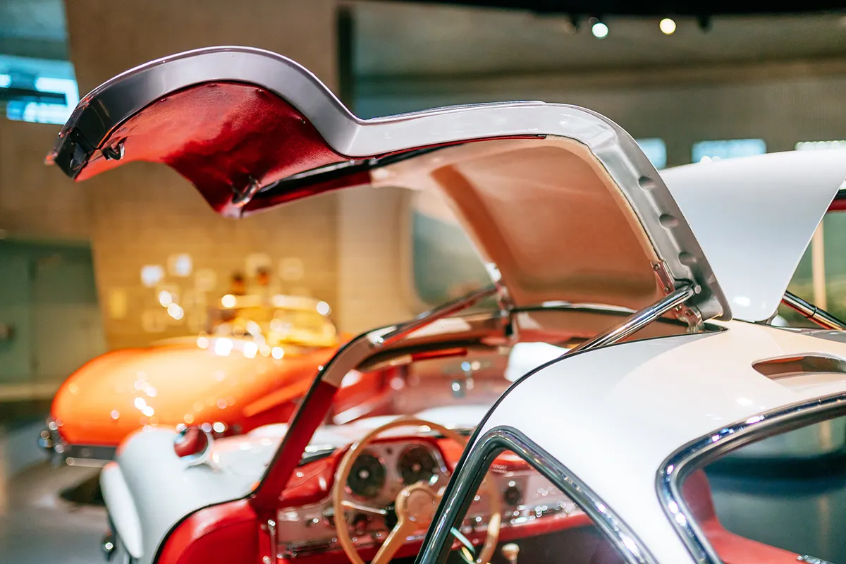 As portas de abertura para cima foram inspiradas a partir da versão das pistas (W194). O 300 SL Coupé recebeu seu próprio número de série do modelo: W198. As portas em forma de “asa de gaivota” exigiram várias soluções específicas de design e construção. As molas montadas no topo eram discretas, mas essenciais. Elas facilitavam a abertura das portas e as mantinham na posição aberta – um recurso de conforto importante para a versão de produção. As molas estavam alojadas em elegantes tubos cromados.