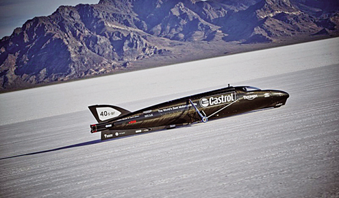 Um misto de foguete com motocicleta promete quebrar a barreira dos 643 km/h. Batizada de Castrol Rocket, o veículo carrega dois motores 2.3 emprestados da Triumph Rocket III. A dupla fornece 1000 cv a 9.000 rpm só na roda traseira, com torque de 69,1 kgfm. São quase 8 metros de comprimento, apenas 60 centímetros de largura e menos de um metro de altura. A carenagem é feita de Kevlar com fibra de carbono, material superleve e com uma resistência altíssima. Em cima dela, o ex-piloto de MotoGP Jason Di Salvo tentará superar os 601 km/h que Rocky Robinson cravou em 2010 com uma moto-foguete de dois motores Suzuki. A moto foi testada nesta semana nas planícies de sal de Bonneville, nos Estados Unidos, e a data para o desafio ainda não foi anunciada.