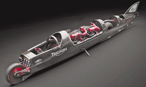 A Castrol Rocket tem a incumbência de estabelecer o novo recorde mundial para a Castrol e a Triumph. Os números por trás do protótipo aerodinâmico, construído à mão em 2013, impressionam: dois motores turbo Triumph Rocket III de três cilindros localizados atrás do piloto conferem à roda traseira mais de 1000 cv. Cada um dos dois motores em linha tem um deslocamento de 1485 cc. O desempenho máximo é obtido quando o motor atinge a velocidade de 9000 rpm.