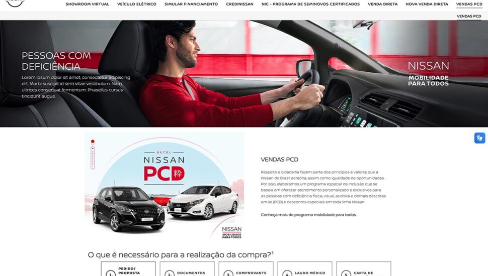 Dentro do seu foco de oferecer a melhor experiência digital a todos seus clientes, a Nissan lançou uma nova área dedicada às pessoas com deficiência (PCD) interessadas em mais informações e na compra de um modelo da marca. No site da marca (www.nissan.com.br) é possível encontrar as novidades que tornam o uso muito mais amigável e informativo.
