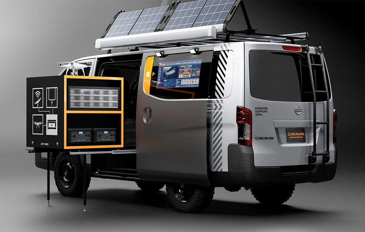 ● Especificações de suporte a desastres: O conceito Nissan Caravan foi projetado para suporte a desastres. Com base nos comentários recebidos dos clientes sobre o Disaster Support Mobile-Hub exibido em janeiro, o design evoluiu com foco na praticidade. O modelo atual apresenta a bateria portátil da LEAF estrategicamente posicionada, aprimorando sua funcionalidade. Além do uso diário, ele foi projetado para dar suporte a atividades de socorro a desastres por vários dias em caso de emergência.