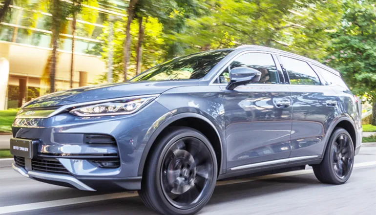 O BYD TAN EV tem linha de cintura elevada e as rodas de liga leve de 22”, que reforçam o perfil robusto do SUV 100% elétrico.