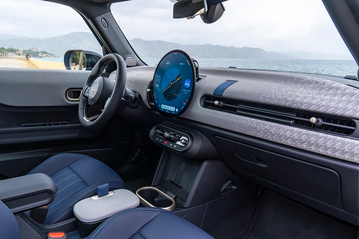 Principal chamariz do habitáculo, o display redondo de 240 mm de diâmetro, posicionado ao centro no painel, concentra todas as informações do carro e é uma releitura dos primeiros modelos Mini, que reuniam todas as informações em um só lugar. A tela OLED tem altíssima resolução e é a mesma utilizada nos smartphones mais modernos à venda no mercado.