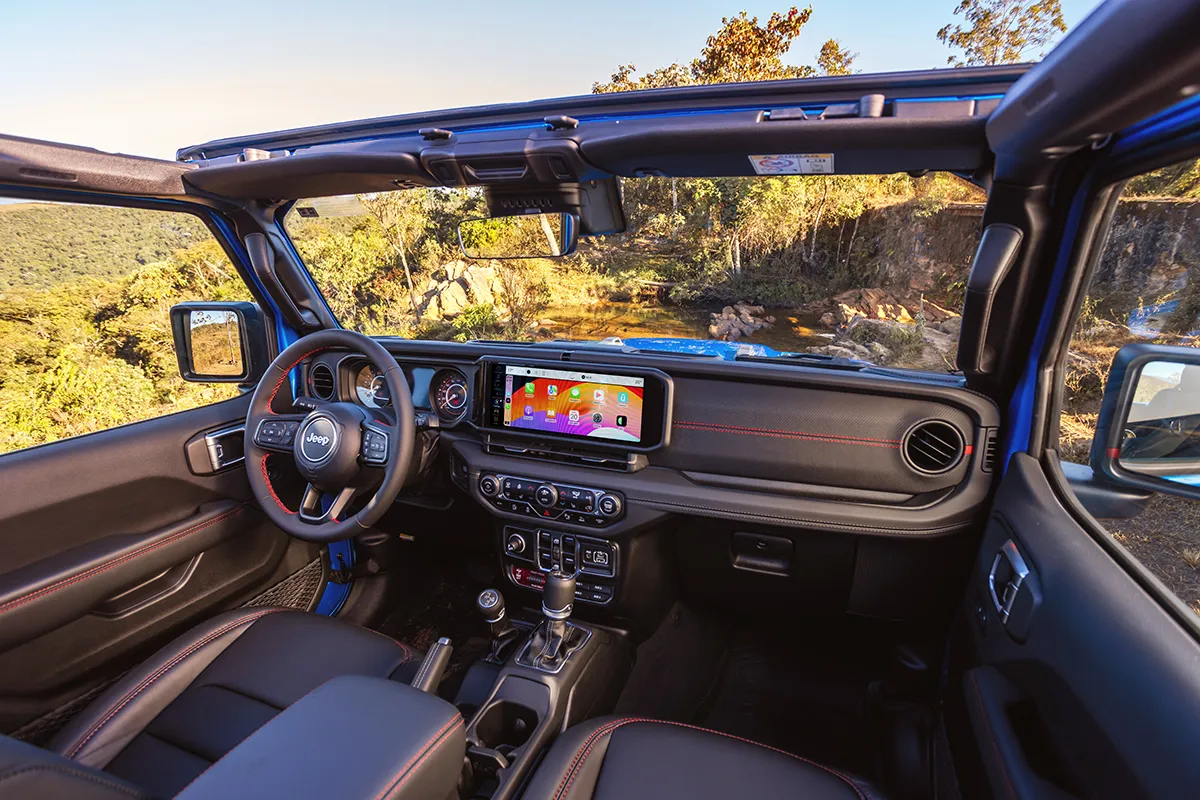 Uma das grandes novidades é o interior totalmente renovado nos dois modelos, com novo sistema multimídia touchscreen de12,3 polegadas – a maior e mais avançada tela já disponível no Wrangler e no Gladiator – integra o premiado sistema Uconnect 5 da quinta geração e está posicionado de forma proeminente no topo do console central, por cima da nova saída de ar interior retangular. As saídas de ar exteriores mantêm a sua forma circular caraterística.