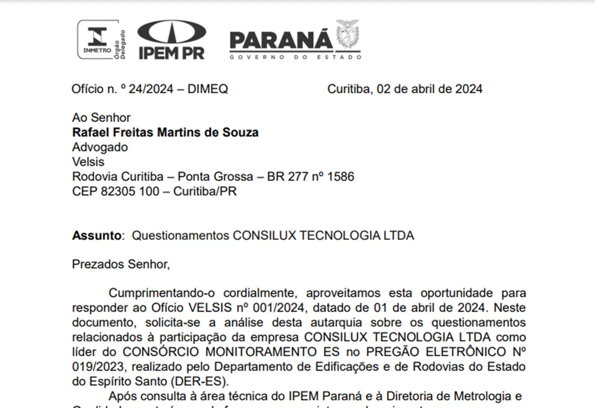 O parecer do IPEM foi assinado pelo Diretor de Metrologia e Qualidade, Gabriel Perazza Justino, e enviado nesta terça-feira (02/04). A Velsis – empresa fabricante de tecnologia em mobilidade, proprietária dos radares que estão instalados e responsável pela concessão entre os anos de 2014 a 2024 – questionou formalmente o IPEM e obteve a resposta (imagem em anexo).