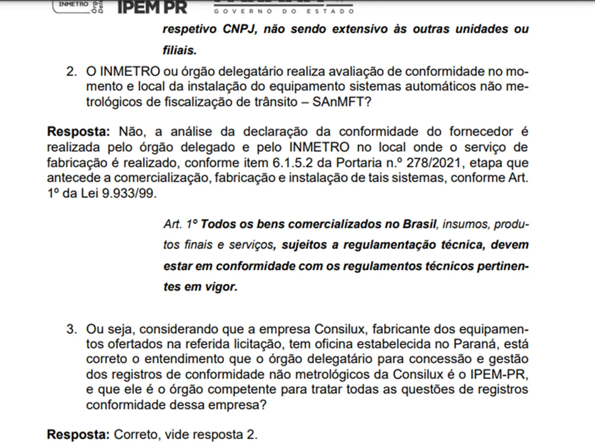 No entanto, em consulta realizada à Diretoria de Metrologia e Qualidade do IPEM (Instituto de Pesos e Medidas do Paraná) foi enviado parecer de que os equipamentos a serem disponibilizados para o DER não possuem homologação para as funcionalidades de constatar avanço de sinal vermelho e parada sobre a faixa de pedestres. Ou seja, não sendo homologados, geram infrações irregulares para a população.