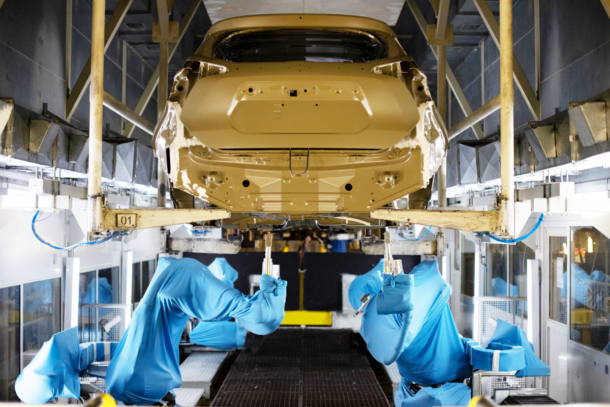 No prédio da Pintura, quatro novos robôs são responsáveis pela proteção inferior das carrocerias. Em uma dança ordenada e precisa, eles aplicam automaticamente a vedação e uma massa protetiva contra ruídos e pequenos impactos nos chassis do SUV da Nissan.
