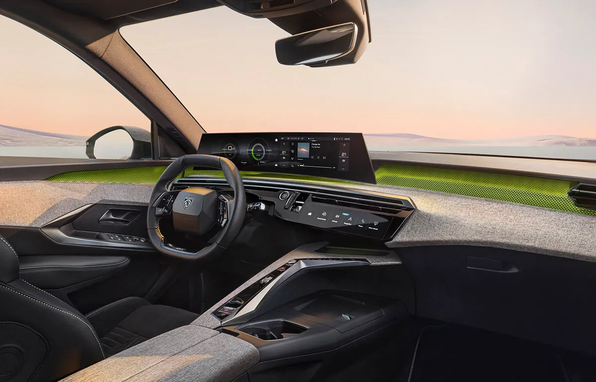 No interior, a espetacular tela panorâmica flutuante de 21″ do novo Peugeot Panoramic i-Cockpit® coloca os passageiros em um ambiente que é tão high-tech quanto intuitivo.