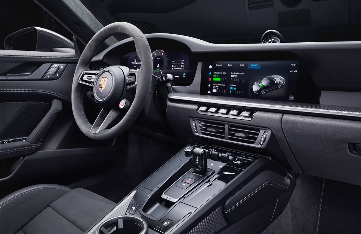 No cockpit, a Porsche combina o DNA de design familiar do 911 com tecnologia moderna: o conceito de controle Porsche Driver Experience foca no eixo do motorista e na operação intuitiva e mais rápida. Elementos de controle essenciais foram dispostos diretamente no volante ou ao redor dele. Estes incluem o interruptor de modo de condução padrão, a alavanca de assistência ao motorista revisada e, pela primeira vez no 911, um botão de partida – à esquerda do volante, naturalmente. No compartimento de armazenamento do console central do novo 911, há um compartimento refrigerado para smartphones, com função de carregamento indutivo.