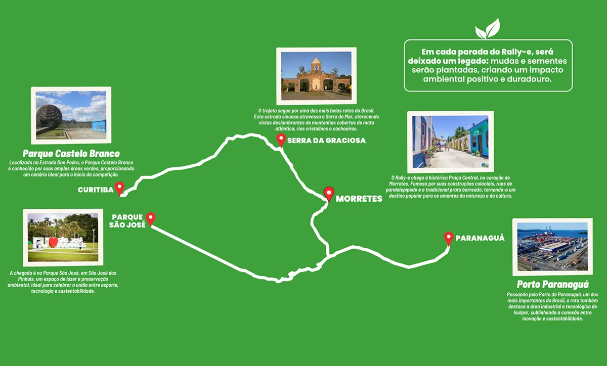 O rally também passará pelo Porto de Paranaguá, um dos mais importantes do país. Os competidores terão a possibilidade de reabastecer a energia de seus veículos em postos de recarga localizados na sede do Grupo de Ensino Isulpar, na cidade litorânea. O trajeto será concluído no Parque São José, em São José dos Pinhais, após subida pela BR-277, totalizando 215 km.