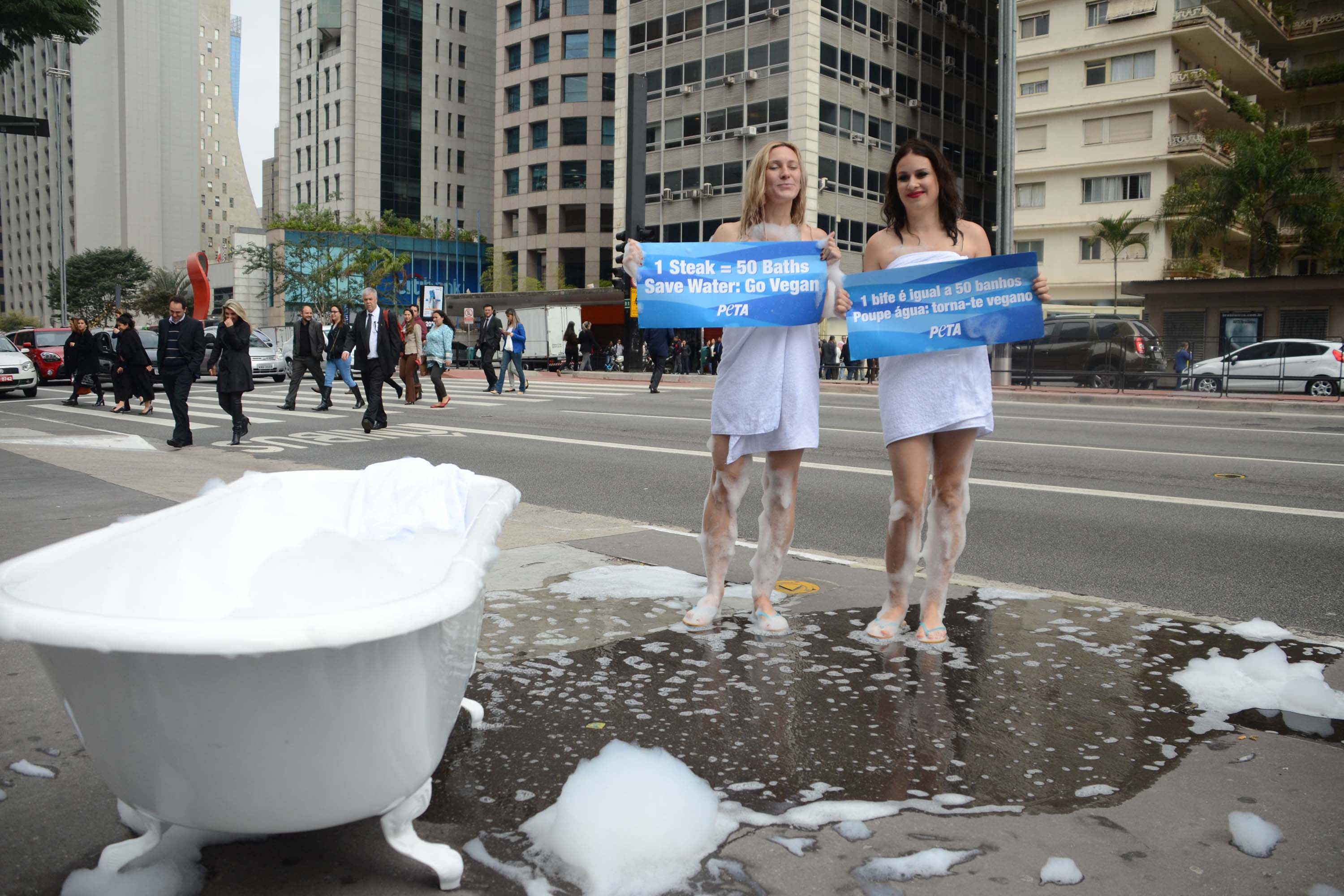 SP - ATIVISTAS-TOMAM-BANHO-ESPUMA-AVENIDA-PAULISTA - GERAL - Duas ativistas da ONG Internacional PETA de Defesa dos Animais e da Água, realizaram uma ação na Avenida Paulista, em São Paulo (SP), nesta terça-feira (02). Com placas pedindo o consumo consciente da água no planeta e para que as pessoas não consumam carne, elas encheram uma banheira com água e espuma e simularam banho. 02/08/2016 - Foto: J. DURAN MACHFEE/FUTURA PRESS/FUTURA PRESS/ESTADÃO CONTEÚDO
