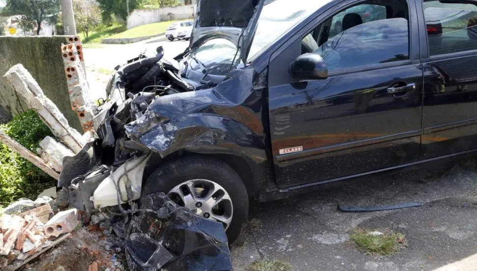Imagem mostra um carro preso envolvido em um acidente de trânsito em Curitiba.