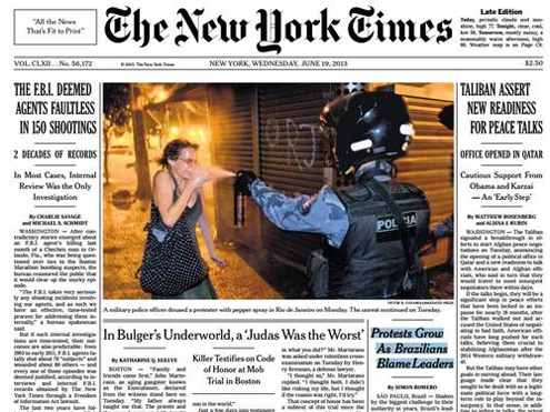 Liv Oliveira, de 23 anos, estampou a capa da edição de ontem do jornal norte-americano “New York Times”, em foto na qual ela aparece sozinha, alvo de um policial que espirra gás pimenta em sua direção. A imagem foi registrada na última segunda-feira, nas imediações da Praça 15, no centro do Rio, após protestos que terminaram em vandalismo em frente à Assembleia Legislativa.