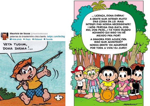 O cartunista Mauricio de Sousa postou em sua conta no microblog Twitter dois recados do Chico Bento e sua turma para a presidente Dilma Rousseff. Mauricio é contra o novo Código Florestal aprovado pelo Congresso Nacional e colocou o lado rural da ‘Turma da Mônica’ para opinar.