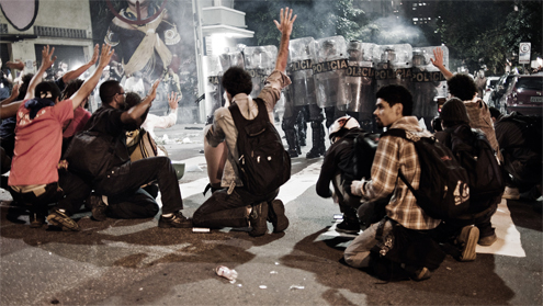 Pelo menos dez feridos ainda eram atendidos na Santa Casa, no início da madrugada. Entre as vítimas, estavam pessoas que apenas passavam pela zona de confronto, como uma mulher atingida por uma bala de borracha na janela de um ônibus. Já os que participaram do protesto, como a estudante Maira Leite, de 25 anos, que teve o braço ferido por um estilhaço de bomba, e seu namorado, Tiago Carvalho, relataram que se sentiram acuados, “presos como em uma ratoeira”. “Mas a gente volta (para o protesto), com mais pessoas, mais vinagre e mais medo”, disse Carvalho.