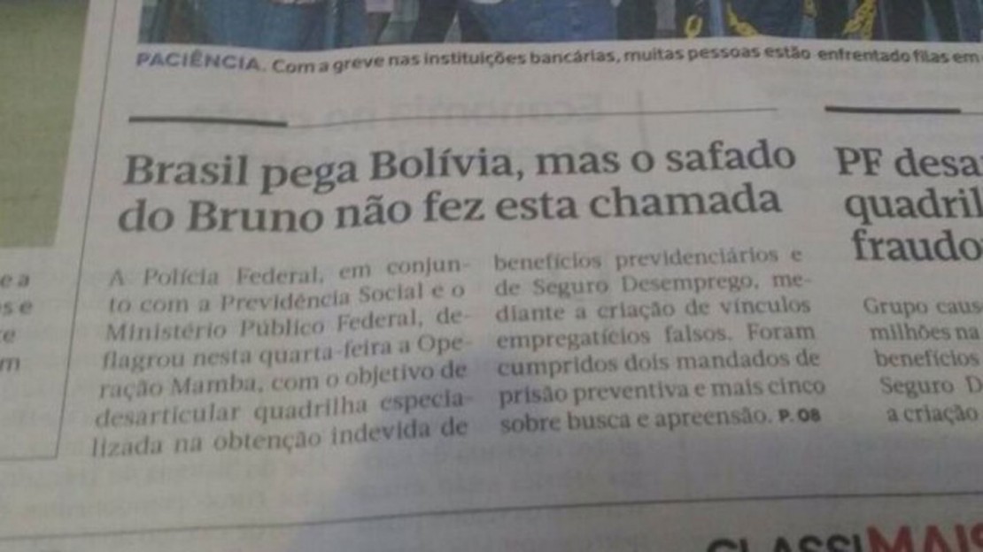 Uma brincadeira de Redação acabou rendendo uma chamada de capa, digamos, diferente para os leitores do diário O Liberal, da cidade de Americana (SP), nesta quinta (06). A chamada do jogo de logo mais entre Brasil e Bolívia, pelas eliminatórias da Copa, acaba não só falando do jogo, mas mencionando também “o safado do Bruno”.