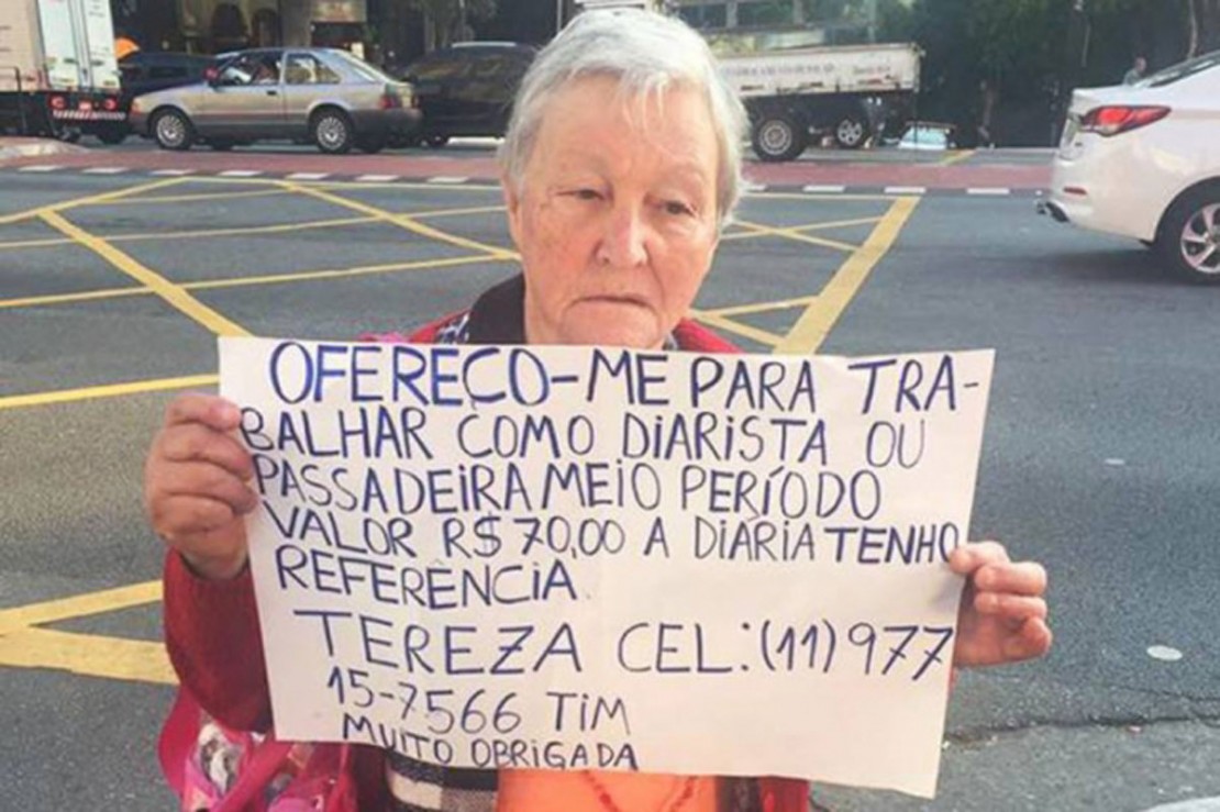 A foto de uma senhora de 72 anos com um cartaz à procura de um emprego na Avenida Paulista, em São Paulo, está ganhando o Facebook. A imagem foi postada na tarde da terça-feira, 27, e já alcançou mais de 13,5 mil compartilhamentos.