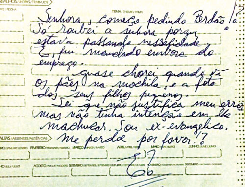 No recado escrito no caderno usado por ela em um supletivo, o ladrão justificou o assalto, dizendo que estava desempregado e “passando necessidade”. “Quase chorei quando vi a sacola de pães na mochila e a foto dos seus filhos pequenos”, disse no bilhete.
