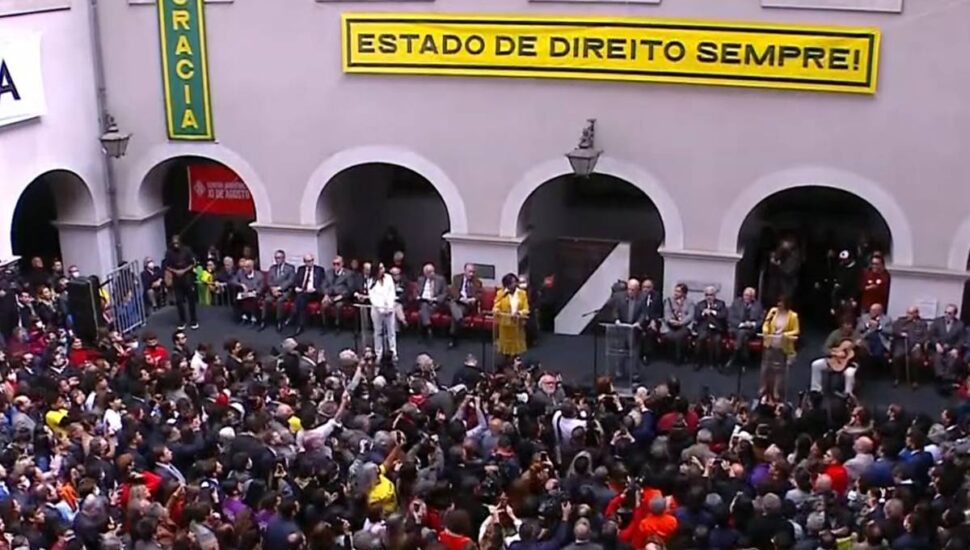 Com a execução do Hino Nacional, a cerimônia de leitura da carta das entidades em defesa da democracia teve inicio por volta das 10h desta quinta-feira (11) no salão Nobre da Faculdade de Direito da USP. A primeira fala do evento foi feita pelo reitor da Universidade de São Paulo, Carlos Gilberto Carlotti Junior, que defendeu eleições livres e disse que a universidade é oposto do autoritarismo.