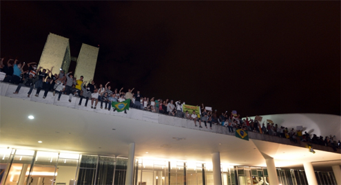 A presidente Dilma Rousseff deixou o prédio e não chegou a ver a chegada dos manifestantes ao topo do Congresso Nacional. Dilma saiu às 19h21, e a segurança do Palácio foi reforçada por militares do Exército, com cassetetes na mão para evitar que os manifestantes possam chegar à sede do governo.