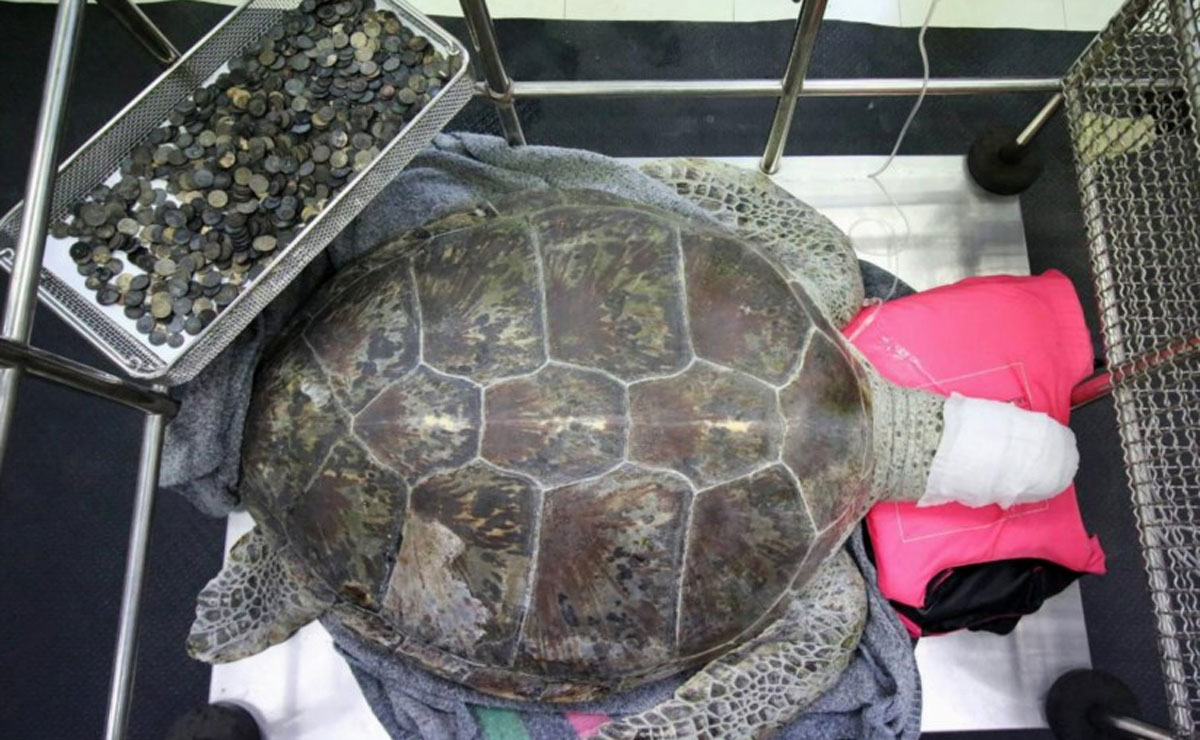 Jogar moedas em fontes para ter sorte é uma superstição popular, mas que quase custou a vida de uma tartaruga marinha na Tailândia, que teve 915 moedas removidas de seu estômago.