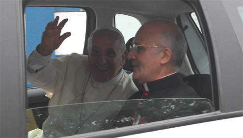 O carro que transportava o papa Francisco teve dificuldade para avançar pela avenida Presidente Vargas, perto do sambódromo, no centro do Rio, por conta da multidão de fiéis que tenta se aproximar do veículo. O carro estava com a janela aberta e o público queria tocar o papa.