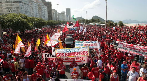 Milhares de bombeiros, familiares e simpatizantes participaram hoje de uma passeata em favor dos militares no Rio, formando na orla de Copacabana um corredor vermelho, cor símbolo da corporação. O movimento contou com forte apoio da população, com a presença de muitos idosos e crianças, que vestiram blusas e fitas vermelhas.