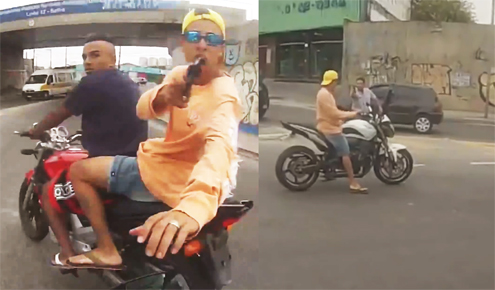 Um vigilante de 35 anos com uma câmera acoplada no capacete filmou um assaltante roubando sua moto e logo em seguida um policial militar atirando no criminoso. O caso aconteceu na tarde de sábado (12) em São Miguel Paulista, zona leste de São Paulo. A vítima pilotava uma Honda Hornet branca. No cruzamento das Avenidas Doutor Assis Ribeiro e Gabriela Mistral, as imagens mostram o assaltante, identificado como Leonardo Escarante Santos, de 18 anos, descer da garupa de uma Twister vermelha e apontar a arma para a vítima. “Para, para, para. Dá o alarme”, disse o assaltante.