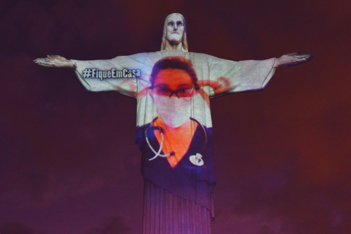 A estátua do Cristo Redentor foi iluminada com a imagem de um médico, de jaleco, e a palavra “obrigado” em diferentes idiomas, em homenagem aos profissionais que estão na linha da frente do combate à pandemia do coronavírus.