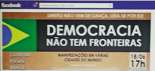 Três manifestações em apoio aos protestos realizados no Brasil reuniram, ontem, centenas de pessoas nas ruas de Berlim (Alemanha), Dublin (Irlanda), Montreal (Canadá) e Boston (Estados Unidos). Todas organizadas pelo Facebook, como nas manifestações que acontecem no Brasil. E se depender da lista. de eventos do Facebook hoje tem mais. O “Vem Pra Janela” congrega todos os brasileiros a vestiram suas janelas de branco indicando solidariedade aos protestos. O “Democracia Não Tem Fronteiras” promete uma manifestação pacífica, hoje, a partir das 17h, na Praça Santos Andrade, Centro de Curitiba. E na sexta (21), tem a 2ª Farofada do Transporte, ocupando a Praça Rui Barbosa das 18h às 20h.