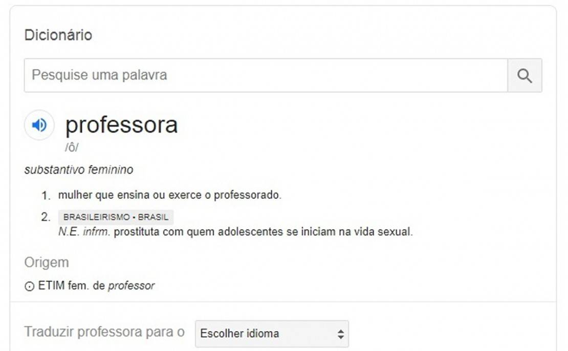 Mesmo sendo uma palavra bastante comum na Língua Portuguesa, o verbete ‘professora’ nos dicionários ganhou status de polêmica nas redes sociais nesta terça-feira (22). Logo no início da manhã, internautas passaram a compartilhar um print que mostra a definição da palavra pelo Google. No buscador, além de “mulher que ensina ou exerce o professorado”, a palavra ‘professora’ também é definida como “prostituta com quem adolescentes se iniciam na vida sexual”.