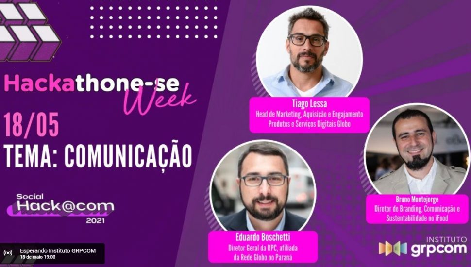 Nesta terça-feira tem o segundo evento da Hackathone-se Week, uma das principais atrações do Social Hackacom 2021. A partir das 19h, o diretor geral da RPC, Eduardo Boschetti, troca ideia com Tiago Lessa, Head de Marketing, Aquisição e Engajamento e Produtos e Serviços Digitais da Globo, e Bruno Montejorge, diretor de Branding, Comunicação e Sustentabilidade do Ifood.
