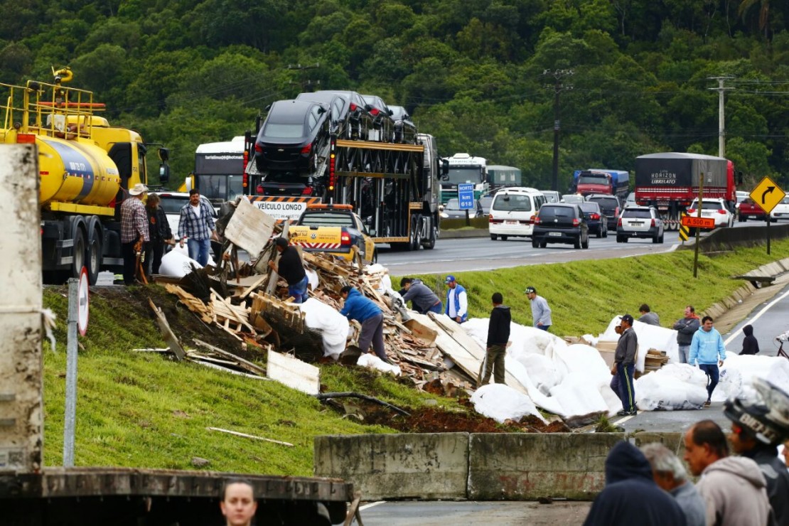 A Polícia Rodoviária Federal (PRF) está no local trabalhando para liberar o tráfego. Uma pista já foi liberada, mas a fila de veículos chega a 10 quilômetros.