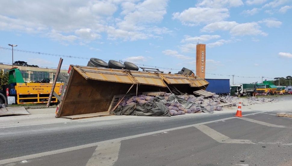 De acordo com a Polícia Rodoviária Federal, o acidente ocorrido por volta das 15h, na pista que leva a Curitiba, causa lentidão nos dois sentidos da rodovia. No sentido capital paranaense, o tombamento da carreta interdita totalmente a pista. No local, o tráfego é desviado para marginal no km 617. Não há informações sobre feridos.