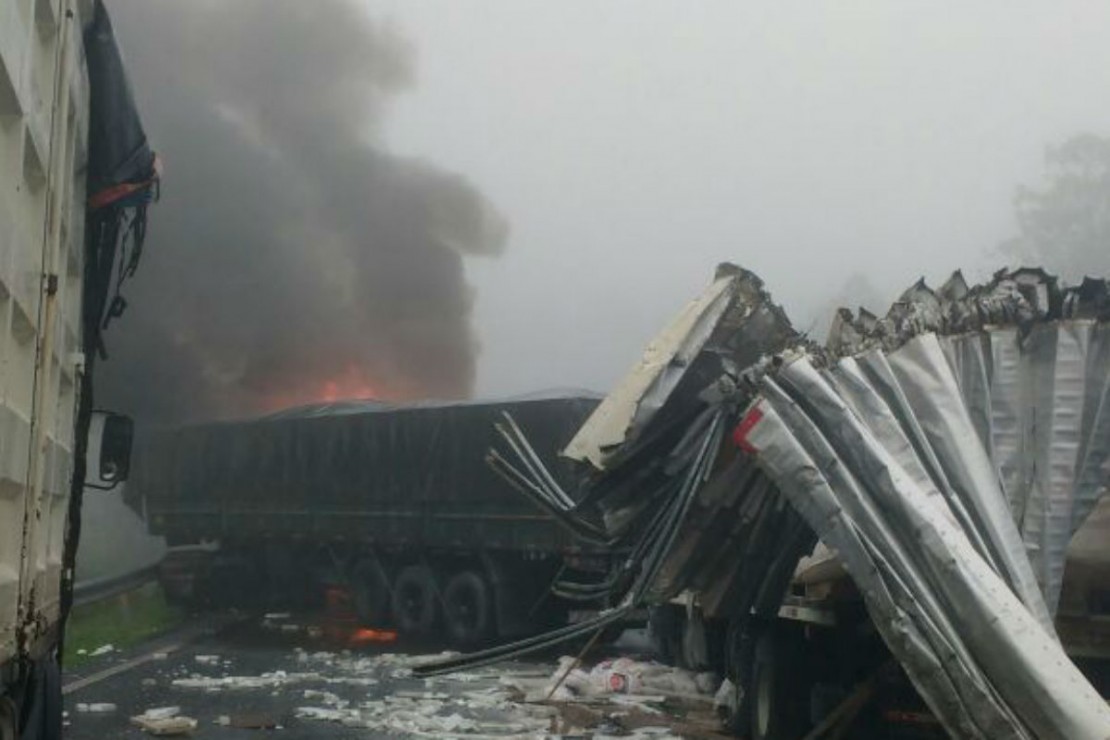 A pancada envolveu dez caminhões e quatro veículos de passeio, sendo que uma das carretas estava carregada com combustível e pegou fogo, incendiando dois caminhões e um dos carros. A Polícia Rodoviária Federal (PRF) e o Corpo de Bombeiros estão no local.