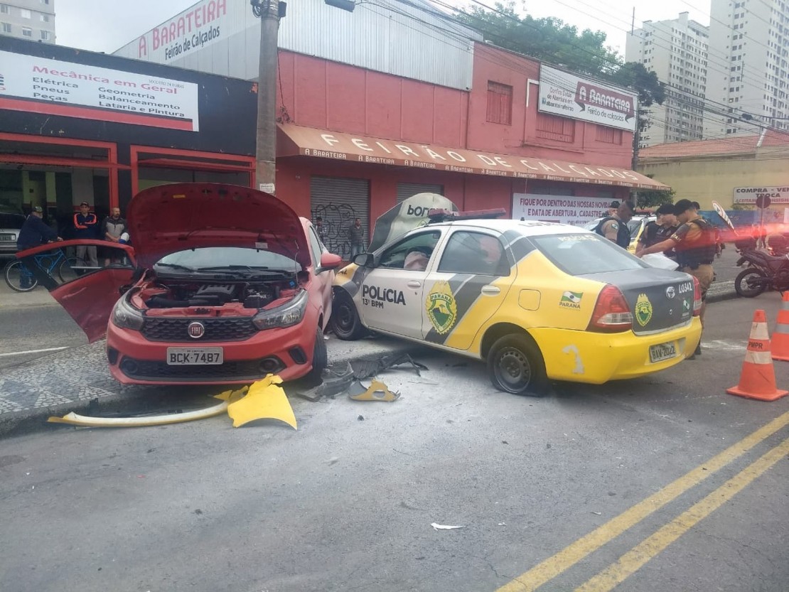 A Polícia Militar (PM) vai apurar as circunstâncias que levaram ao acidente que deixou três pessoas feridas na tarde desta sexta-feira (19) na canaleta de ônibus da Avenida Winston Churchill, no Capão Raso, em Curitiba. A colisão envolveu uma viatura da corporação e um motorista que fazia um retorno. Toda a colisão foi registrada por câmeras de segurança, o que vai facilitar nas investigações.