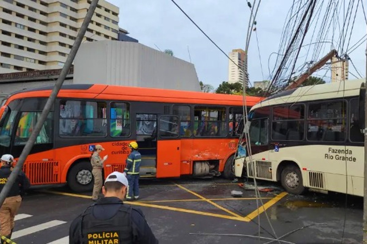 Um acidente entre dois ônibus do transporte coletivo de Curitiba deixou 45 pessoas feridas, de acordo com boletim da Polícia Militar (PM). A colisão ocorreu na manhã deste sábado (9), entre a Avenida Visconde de Guarapuava e a Travessa da Lapa, no centro da capital. A batida foi entre um biarticulado da linha Santa Cândida/Capão Raso e um articulado da linha Fazenda Rio Grande/Curitiba. Veja fotos abaixo.