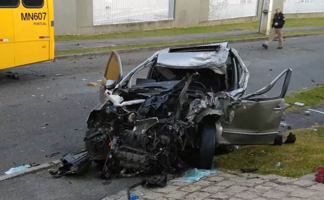 O carro, modelo Fox, invadiu a pista contrária e bateu de frente contra um ônibus da linha Julio Graf. O impacto deixou a frente do carro completamente destruída.