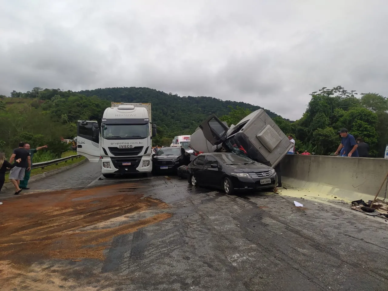 Por volta das 15 horas desta sexta-feira (26), dois carros e dois caminhões se envolveram em um acidente no km 32 da BR-277, na região de Morretes, no Paraná. A colisão aconteceu na pista sentido Litoral.