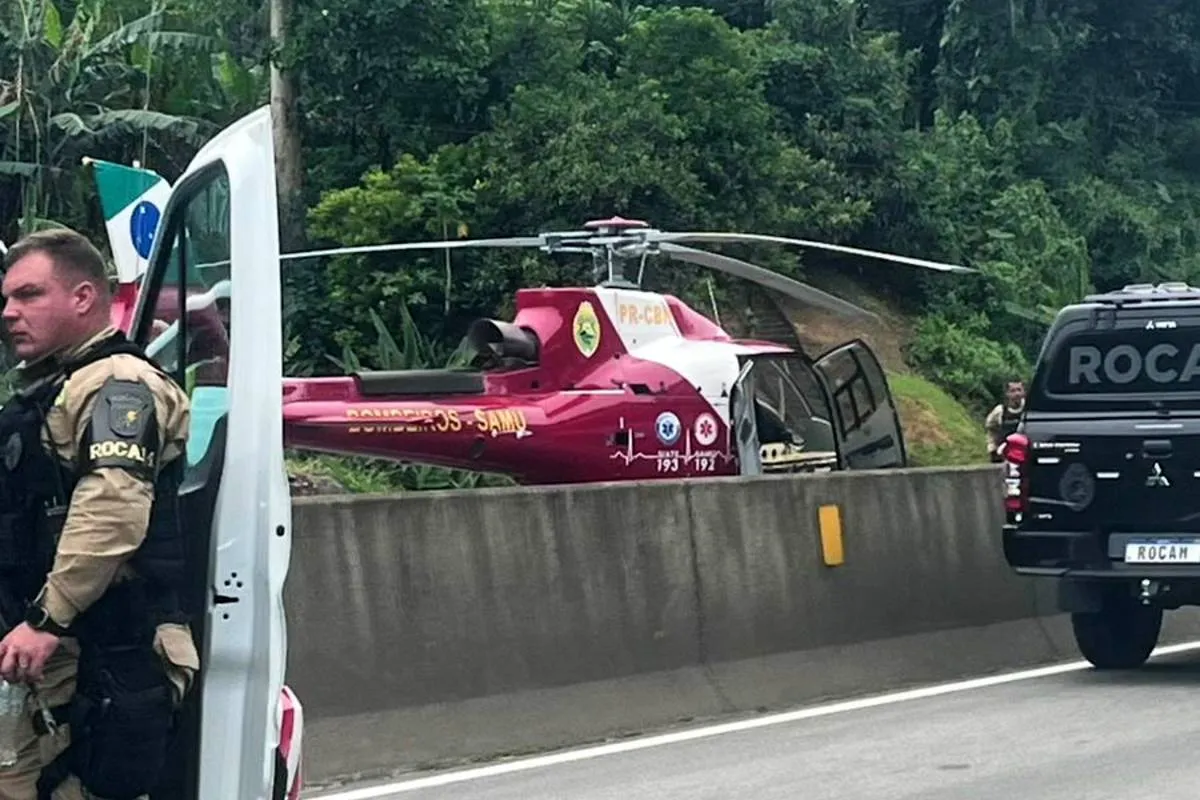 Acidente na BR-277 envolve moto da PM: vítima grave e helicóptero na pista