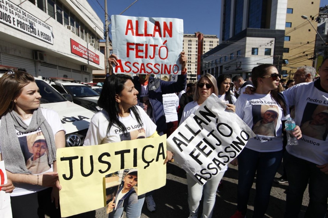 Clamando por Justiça, cerca de 200 amigos e familiares do jovem Pedro Lopes da Luz, de 16 anos – morto com golpes de canivete em um biarticulado, no dia 7 deste mês -, se reuniram em frente à Divisão de Homicídios e Proteção à Pessoa (DHPP), em Curitiba, na manhã deste sábado (22), para homenagear o adolescente e pedir a prisão de Allan Romero Feijó, de 18 anos, rapaz suspeito de ser o autor do crime.