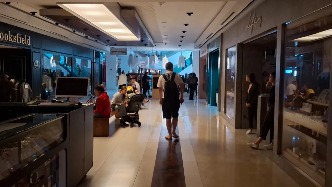 A falta de luz não deixou o shopping no escuro. Luzes de emergência passaram a funcionar automaticamente, garantindo iluminação nos corredores do centro de compras.