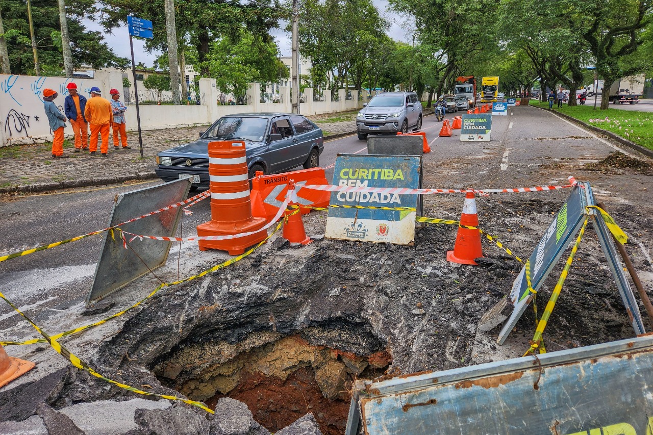 Na avaliação foi constatado que, por baixo do asfalto, a força das águas pluviais decorrentes das recentes tempestades causou a quebra da caixa de ligação e tubulação que está a aproximadamente 4,5 metros de profundidade, comprometendo a galeria pluvial naquele trecho.