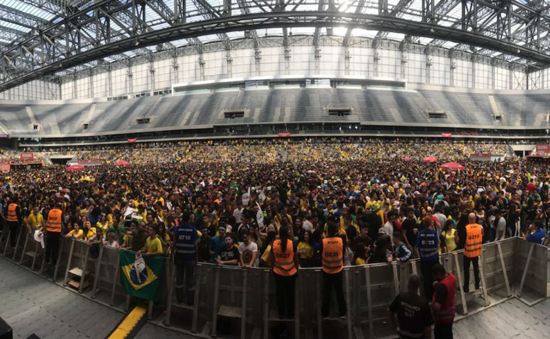 O curitibano está a fim de ver o Brasil ganhar mais uma disputa da Copa do Mundo de 2018. Nesta sexta-feira (6), a capacidade máxima da Arena Brahma N1 esgotou antes mesmo das 14h e, desta vez, mais de 15 mil pessoas vão acompanhar o jogo direto da Arena da Baixada, em Curitiba.