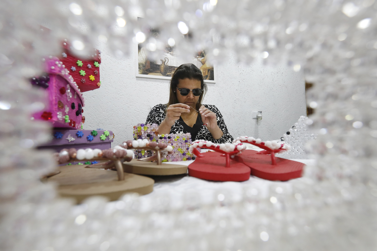 “Eu preciso de alguma ajuda na hora de comprar e também para separar as pedras, escolher as cores que combinam. Depois eu faço tudo sozinha. Em épocas especiais, como no último Natal, eu aproveito para produzir mais peças. Em dezembro agora eu fiz 30 pares de chinelos, além de outras peças diversas”, explica a artesã.